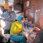 Las intrigantes revelaciones de  Razuvaev y el agradable calor y olor proveniente de la cocina -donde Olga, la cocinera, prepara un típico desayuno- no evitan que sintamos deseos de echar una cabezadita en el habitáculo principal del barco. Pero no. Es necesario ser fuertes para disfrutar de prístina belleza que nos brinda la panorámica lacustre. Especialmente, porque quién nos garantiza cuándo tendremos una nueva oportunidad de disfrutar de tanta hermosura, acompañada, además, por los cánticos patrióticos que Soelma Zhambalova, una de nuestras guías, entona así: “Oh, Gran Baikal, tierra de dioses protectores y milagros, te pido me concedas tus favores, buena suerte y salud”.La oda merece un brindis. ¿Adivináis con qué?