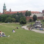 Lo ideal, antes de acometer la subida a Wawel y recorrer con detenimiento todos sus edificios, es presenciar el conjunto desde algunas de las orillas del Vístula, apreciando así su armonía. La colina de Wawel, en la que destaca la catedral con sus tres torres diferentes y el castillo, reflejándose sobre las tranquilas aguas del río, es la mejor perspectiva de Cracovia y, probablemente, una de las más espectaculares panorámicas de Europa. Es éste además un lugar muy popular. En las apacibles praderas que bordean el Vístula pasean las parejas, juegan los niños o se organizan pequeños pic-nics. Unas mesas de madera suelen ser lugar de cita de ancianos y también jóvenes que disputan interminables partidas de ajedrez. Un camino asfaltado, en fin, suele congregar a los ciclistas y patinadores.