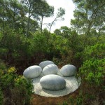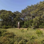 Ya en el exterior, nos encontramos con un espacio de 16 hectáreas en el que poder perderse entre olivos, eucaliptus, lavanda y viñedos. Y sorprenderse también entre los bosques por tres bellos y gigantes moais,obra del autor español-catalán Jaume Plensa, que parece haberse inspirado en los de la lejana isla chilena, y a los que ha titulado “Los tres alquimistas”. Su forma estirada hacia el cielo les confiere un aura particular, casi mística. Las estatuas parecen estar dotadas de un nivel de elevada consciencia, convirtiéndolas en  guardianes de un saber olvidado por los hombres. Asimismo, en ese entorno se descubren piezas miedo ocultas. Como lo grandes huevos de mármol creados por Nils Udo. Todas las obras monumentales del exterior -y muy especialmente las de Jaume Plensa, artista que ha expuesto ya en los Estados Unidos- son una invitación a la contemplación, la reflexión y la introspección. Si no es autopsicoanálisis, poco le falta. Todo un  exitoso acierto en una isla-museo que antaño refugió corsarios y ahora acoge arte que hace pensar…