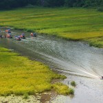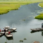 A pocos kilómetros de Halong se encuentra Tam Coc, lo que algunos han llamado “Halong en tierra” porque, en efecto, el paisaje es muy similar, con los enormes peñascos forrados de vegetación, los paredes verticales y las formas deslumbrantes, pero sustituyendo las turquesas aguas del golfo de Tonkín por extensos arrozales en todas las gamas de verde y amarillo, solo interrumpidos por el tranquilo cauce del río Ngo Dong y las cientos de pequeñas barcas conducidas por remeros –y sobre todo remeras– que las surcan tranquilamente.