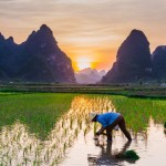 No hay que alejarse mucho del golfo y sus pedruscos protagonistas para encontrar un paisaje casi idéntico, en el que el mar ha sido sustituido por extensos arrozales cruzados por un sinuoso río. Se trata de Tam Coc, un precioso paraje natural en la provincia de Ninh Binh que muchos definen como la Bahía de Halong en tierra y también reconocido como Patrimonio de la Humanidad. Otros lo han denominado “el sueño hecho realidad”. Las formaciones rocosas, las cuevas, el agua y el paisaje son el decorado adecuado a los inmensos arrozales que cuando están en su máximo esplendor, tienen un color verde brillante con tonos amarillos, que terminan en el comienzo de los acantilados de las formaciones rocosas. El paraje natural de Tam Coc se recorre en pequeñas barcas de remos para dos o tres pasajeros que surcan el río Ngo Dong, manejadas diestramente en su mayoría por mujeres que hacen una jornada de ocho o diez horas, en sucesivos viajes de un par de horas cada uno y cobran el equivalente a unos pocos dólares. Curiosamente, reman con los pies. Como hacen ellas, es aconsejable utilizar el típico gorrito vietnamita de caña y bambú, el Nón Lá, para protegerse del sol.