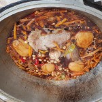Tal vez sea este un buen momento para hacer un alto y disfrutar de la gastronomía de Uzbekistán, que, como centro que fue de la Ruta de la Seda, tiene influencias de muchos países. El plato tradicional del país es el Plov del que hay hasta 60 variantes y, como casi todo aquí, parece que fue un invento del gran Tamerlán. Se cocina con carne de cordero mezclada con arroz y acompañada de cebolla, zanahoria, pasas y especias como el comino y el cilantro. También son frecuentes en cualquier comida los Shashlik, pinchos de carne de cordero, ternera, pollo o hígado de ave, a menudo servidos con cebolla cruda y las Samsá, unas empanadillas cocidas en horno de barro con diferentes rellenos de carne picada con cebolla, calabaza, patatas o verduras.