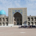 El esplendor que hoy lucen estas madrazas, las más antiguas y mejor conservadas del mundo, se debe en buena parte al tesón de los soviéticos que supieron rehabilitarlas con maestría tras numerosos terremotos, aunque también se concedieron algunas licencias, como la cúpula azul de la escuela central, donde precisamente se muestra una exposición del estado antiguo y actual del conjunto. La de la izquierda que lleva el nombre del gobernante que la terminó en apenas tres años, Ulugh Beg, nieto de Tamerlán, apasionado de la astronomía, de la que impartía clases, está decorada con infinitas estrellas. En la madraza central, Tilla-Kari (Cubierta de Oro) terminada en 1660, hay un agradable patio ajardinado y una mezquita decorada en azul y oro, con una cubierta también dorada que parece abovedada aunque es lisa. Los antiguos dormitorios y algunos espacios libres están invadidos por talleres de lo más diverso, desde escritura a instrumentos musicales y las inevitables tiendas de recuerdos y artesanías, entre las que destacan sus alfombras y cerámicas, vestidos y pañuelos de seda, antiguos bordados y bellos grabados, algunos pintados con café, que muestran las caravanas de la Ruta de la Seda con Marco Polo al frente.