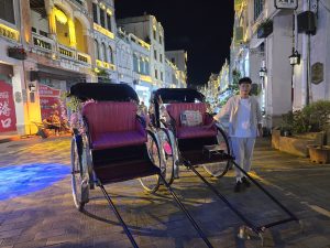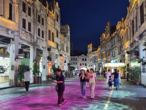 Nada moderna e imprescindible de visitar y recorrer es su calle principal que recibe el nombre de Calle Antigua Haikou Qilou, un conjunto histórico y cultural y el mayor complejo de arcadas mejor conservado de China, compuesto por 12 calles de estilo colonial. Para hacerlo al modo tradicional debe recorrerse a bordo de un rickshaw tirado por uno de los culíes, siempre dispuestos. Llaman la atención, además de las arcadas, las ornamentadas fachadas con relieves alegóricos, la colección de esculturas con temas familiares que bordean la calle y, por supuesto, la colección de tiendas habituales en todos los lugares turísticos: infinitos surtidos de galletas y dulces, souvenirs con lo más típico de la artesanía china, pequeños puestos de comida con todo tipo de despojos y con jugo de cocos, el imprescindible templo budista (en China hay más de 33.000 templos budistas abiertos al culto) en el que colgar los lazos del deseo rojos (hóng xiàn en chino) que consiguen que los deseos se hagan realidad y simbolizan prosperidad, felicidad y buena suerte y los palitos de incienso que se alzan al cielo, y también dos o tres buenos restaurantes, como Shangnan Hall, una antigua tetería con gastronomía de la isla, como la anguila con coco rallado o las manitas de cerdo con jengibre de Yongxing… A lo largo de la calle hay varias otras bellas teterías, en la isla se producen varias clases de té, como el té verde y negro de Wuzhishan o Baisha y lo habitual es consumir el LaoBaCha, que literalmente significa “té del viejo papá”, una mezcla tradicional de té y café con leche.