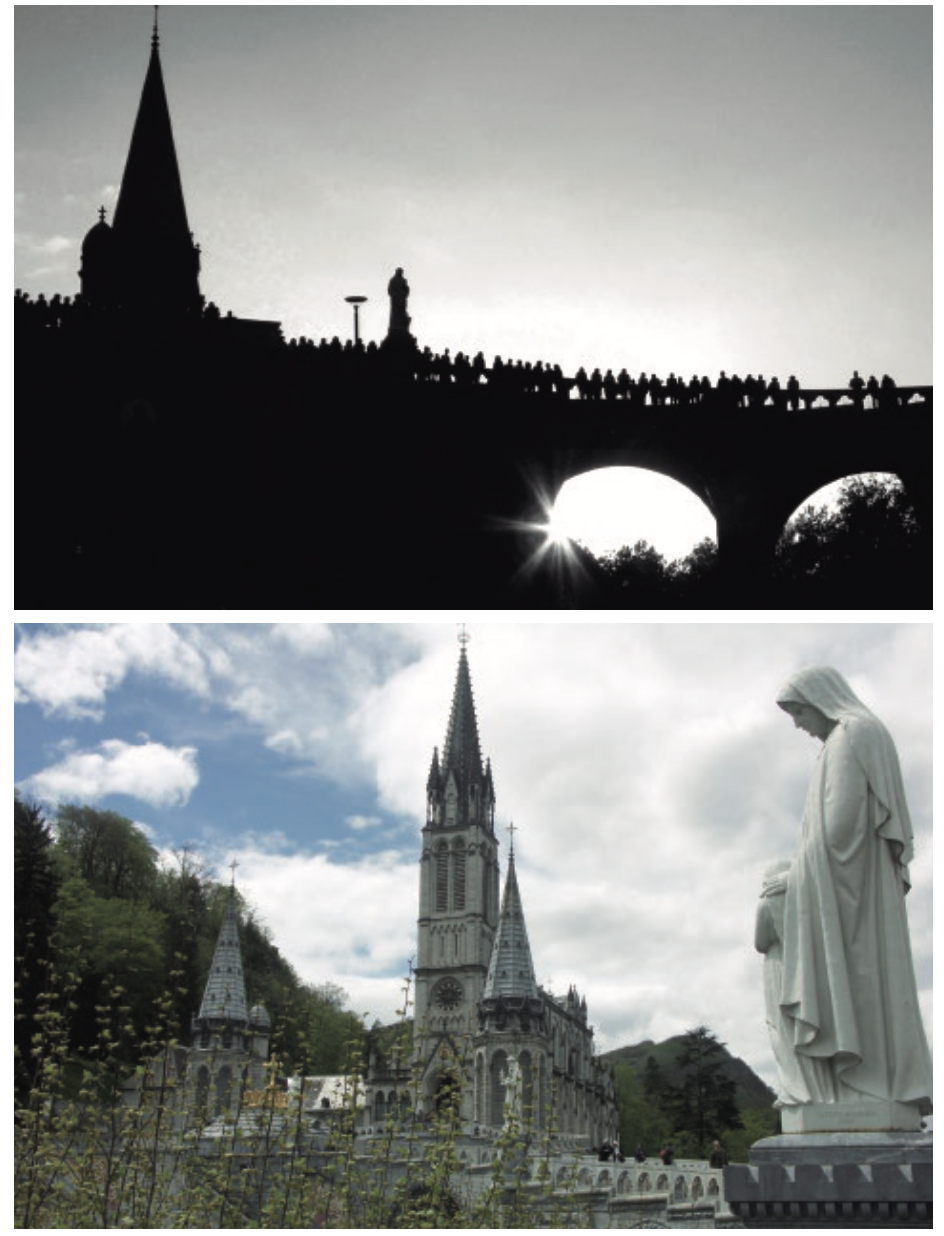 científicos han considerado so- brenaturales muchas curaciones de personas enfermas. Los pere- grinos ofrecen cirios que duran un año y se encienden por los “feutiers” en hileras de hornaci- nas metálicas. Dos toneladas de velas se almacenan anual- mente en esas hornacinas y en los caños de la alargada fuente donde los peregrinos beben o se auto bendicen.